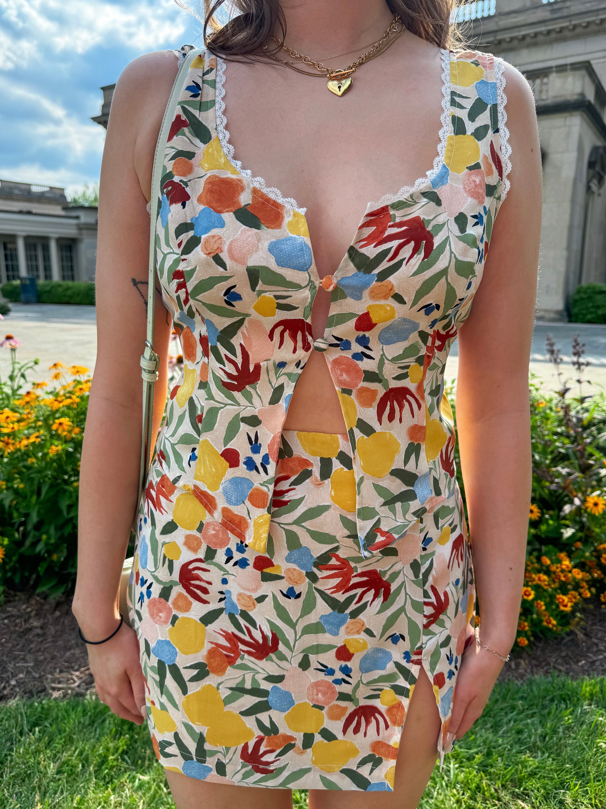 The Cabo Top is the perfect vacation essential! The print, the colors and the style are everything and more! It’s a vest style tank top with lace detailing along the neckline, back and around the arms. It has two buttons on the front as well as a tie in the back so it can be worn and styled as desired. Lastly, it is double lined to ensure that it is not see-through. Pair it with the Cabo Skirt to turn heads while in paradise this summer!