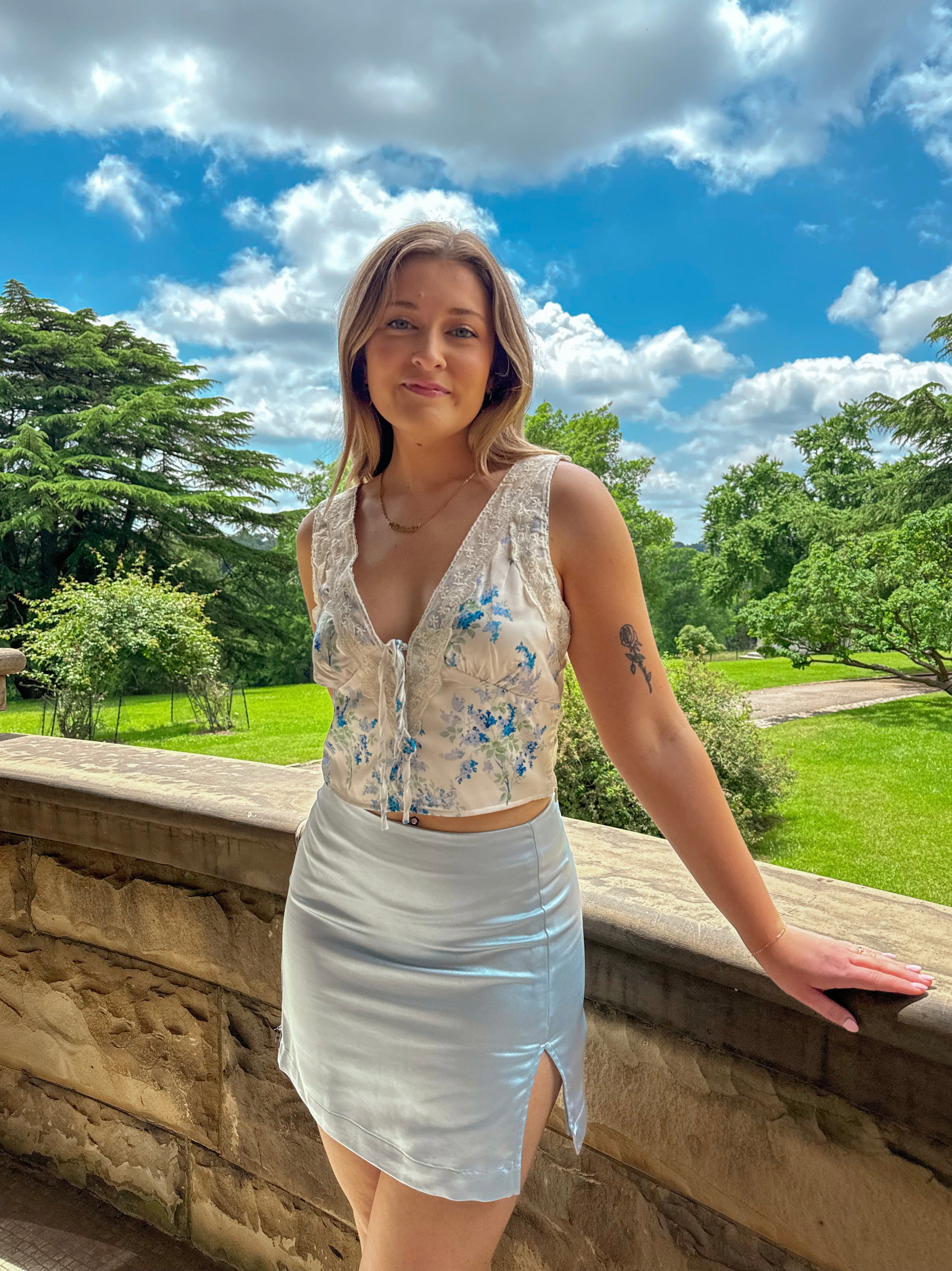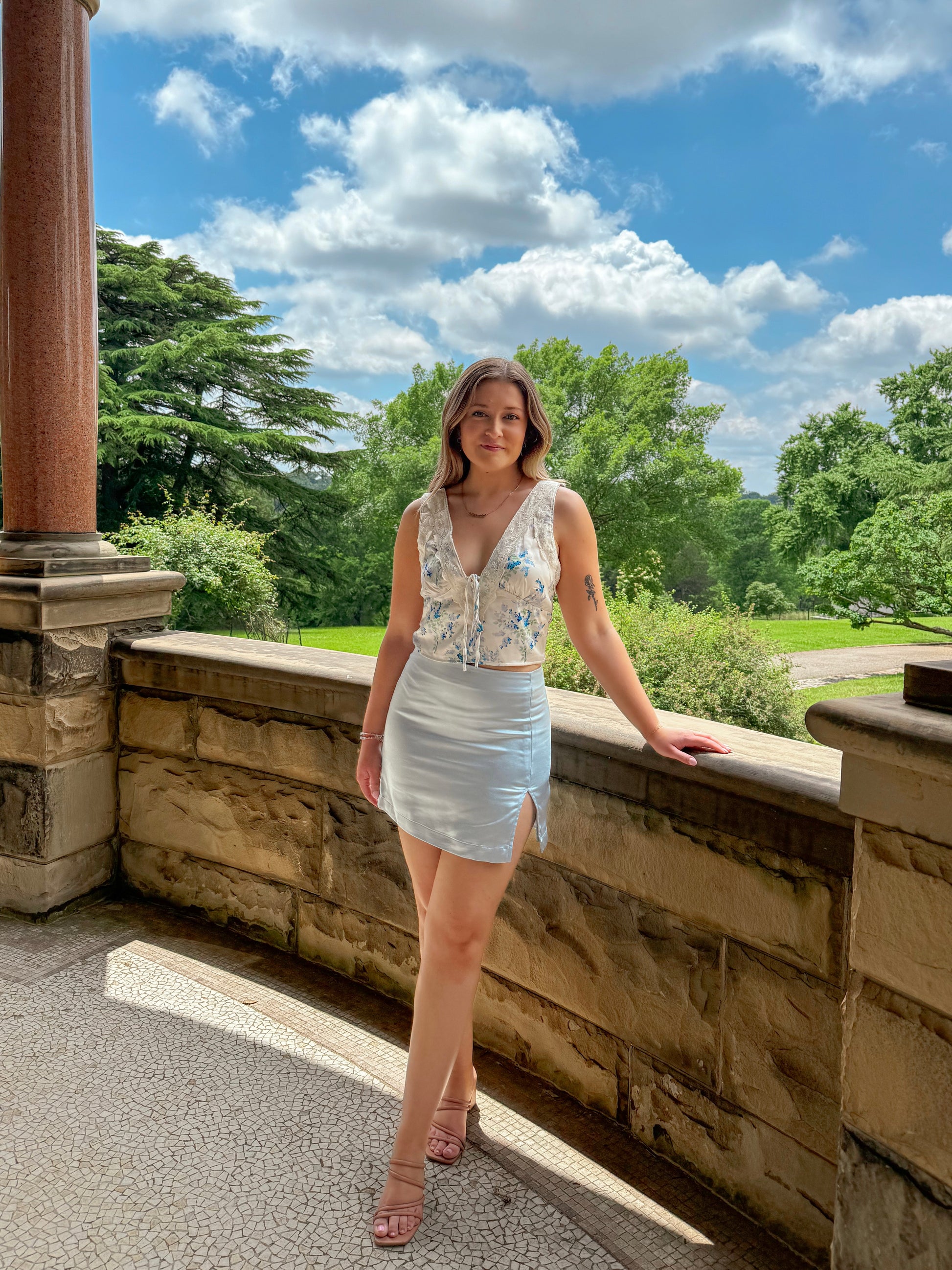 Our Elsa Top has lace detailing throughout and a tie in the front so you can adjust to your desired fit. It is cropped and has a zipper along the side for easy changing. The entire front is double lined to ensure that it is not see through!