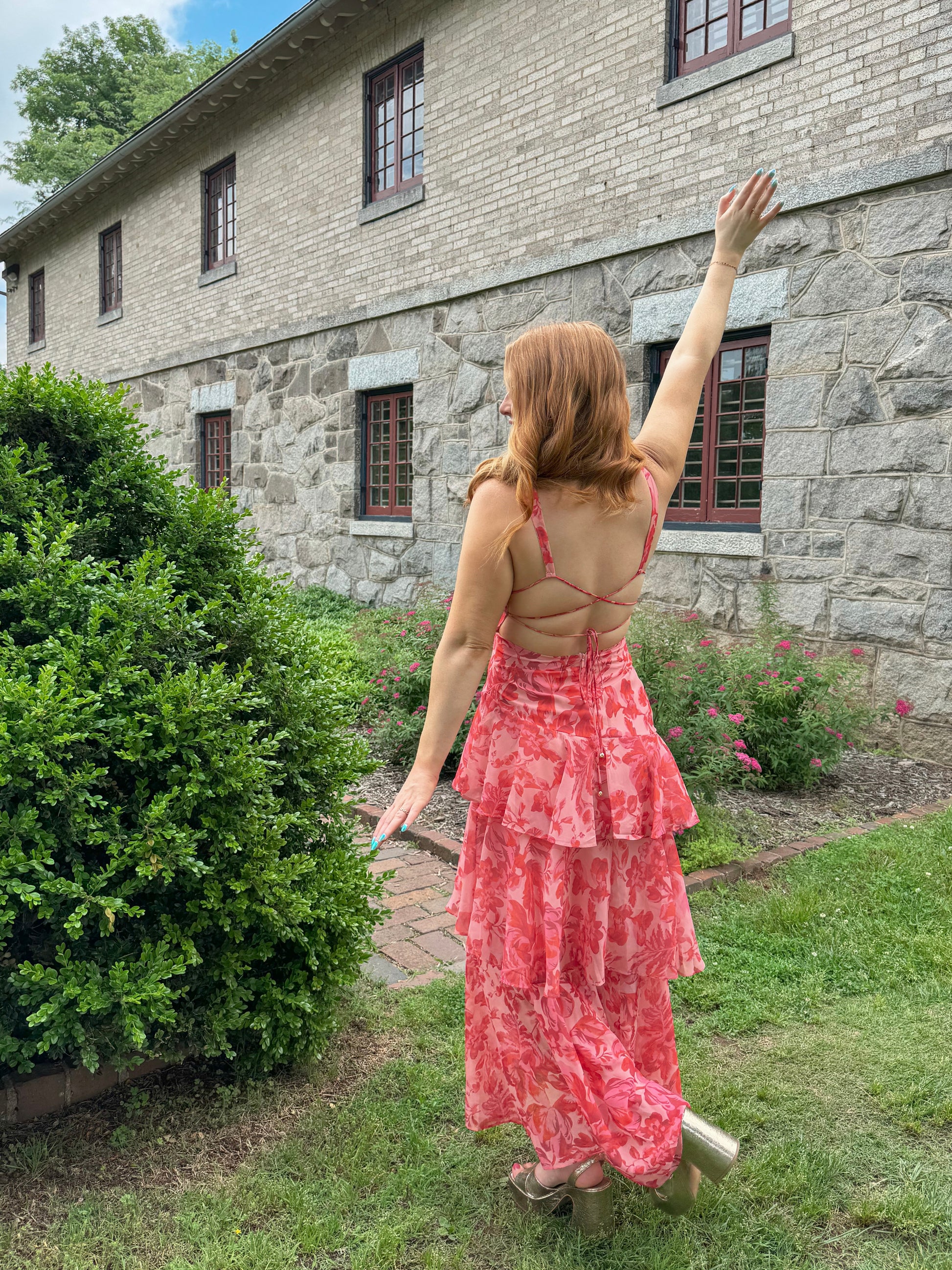 The Francesca Maxi Dress has a three tier ruffle design with an open back and a lace up style string to adjust. It has a flattering plunge cut in the front and a zipper in the back for easy changing. The fabric is very thin and lightweight but it’s double lined to ensure it’s not see-through.