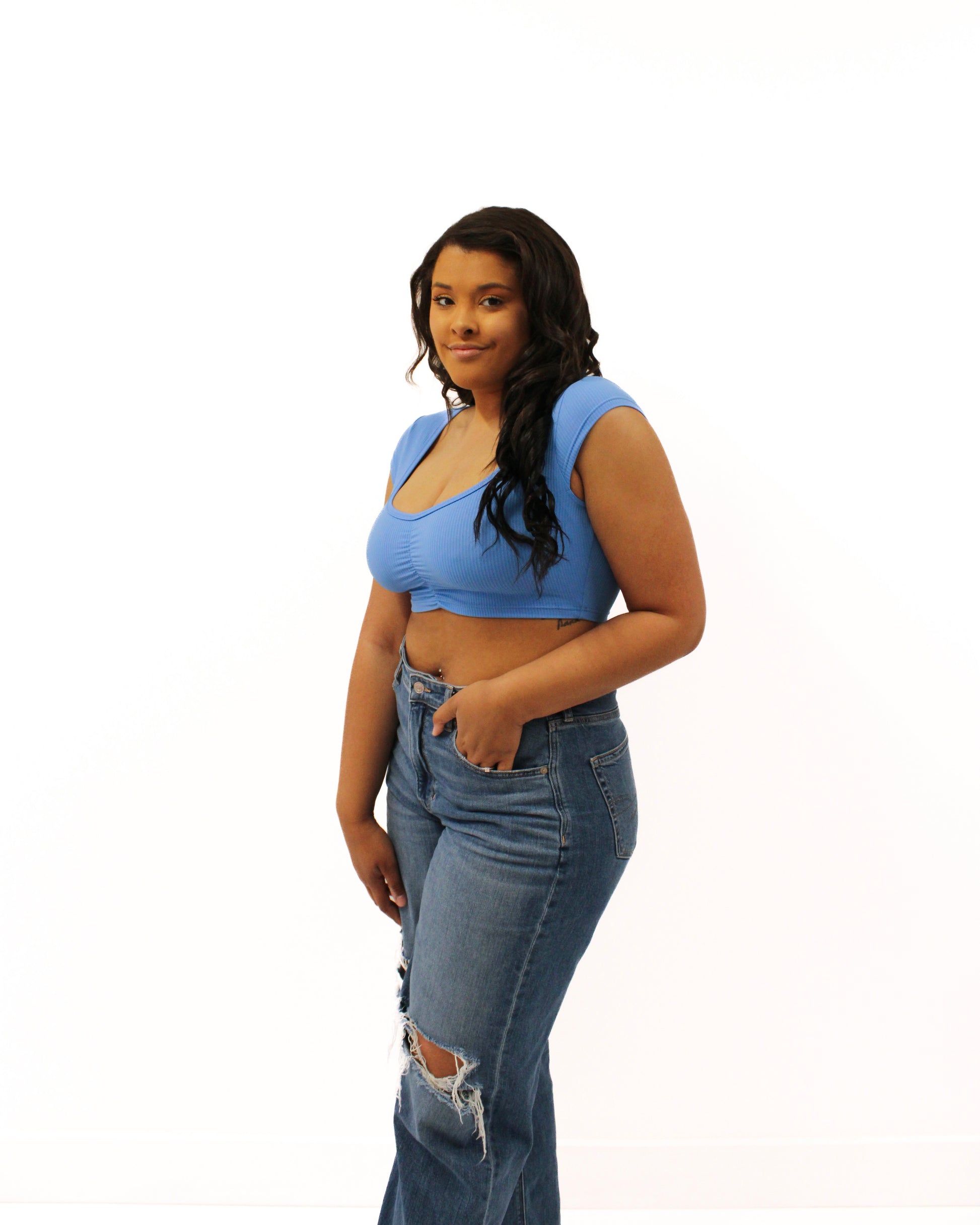 The Kaila Top, named after the gorgeous model in the first photo, is a cropped and ribbed cap sleeve top with extremely stretchy, soft and buttery material. It has a flattering scoop neck and rouching down the front which compliments all body types.
