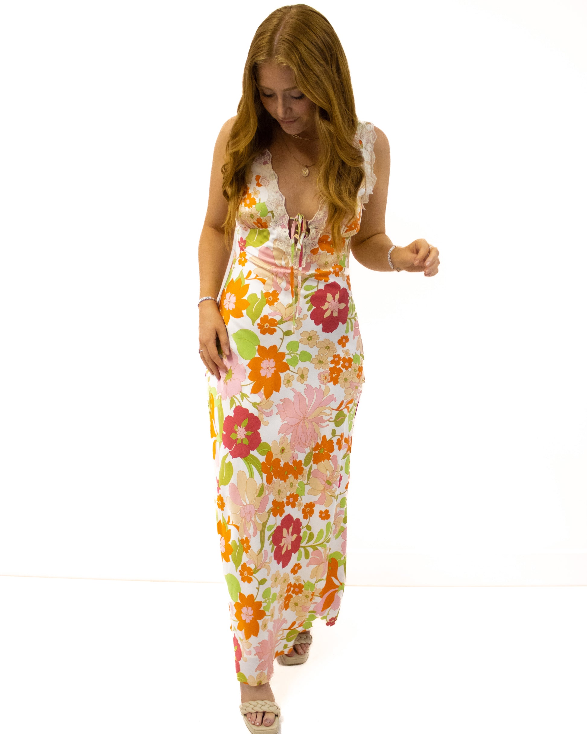 Our Kathleen Dress, named after one of our founders, has the most gorgeous print you’ll ever see. This dress is full length with built-in lining and a side zipper for easy changing. It has a delicate and flirty lace detail along the back and neckline as well as a string that can be tied as desired. This dress flatters all body types but was truly made for Kathleen and her closet.