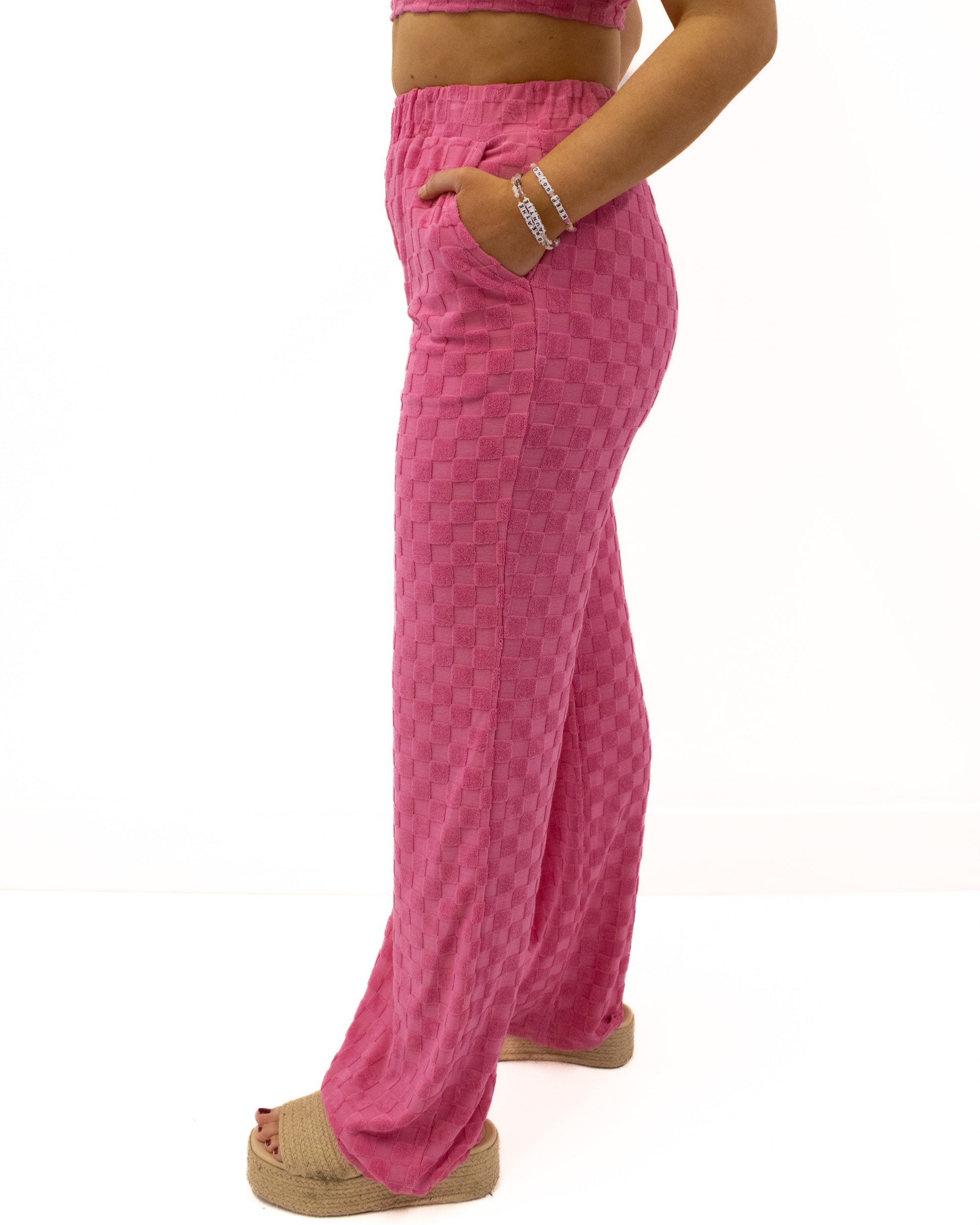 Our Lola Pants are the perfect lightweight, high-waisted casual pant for all year round. They are a textured checkered material and are perfect to wear around the house or to run a quick errand since they have huge pockets, perfect for on-the-go! Pair them with our Lola Top for the ultimate pink lounging set of the summer!