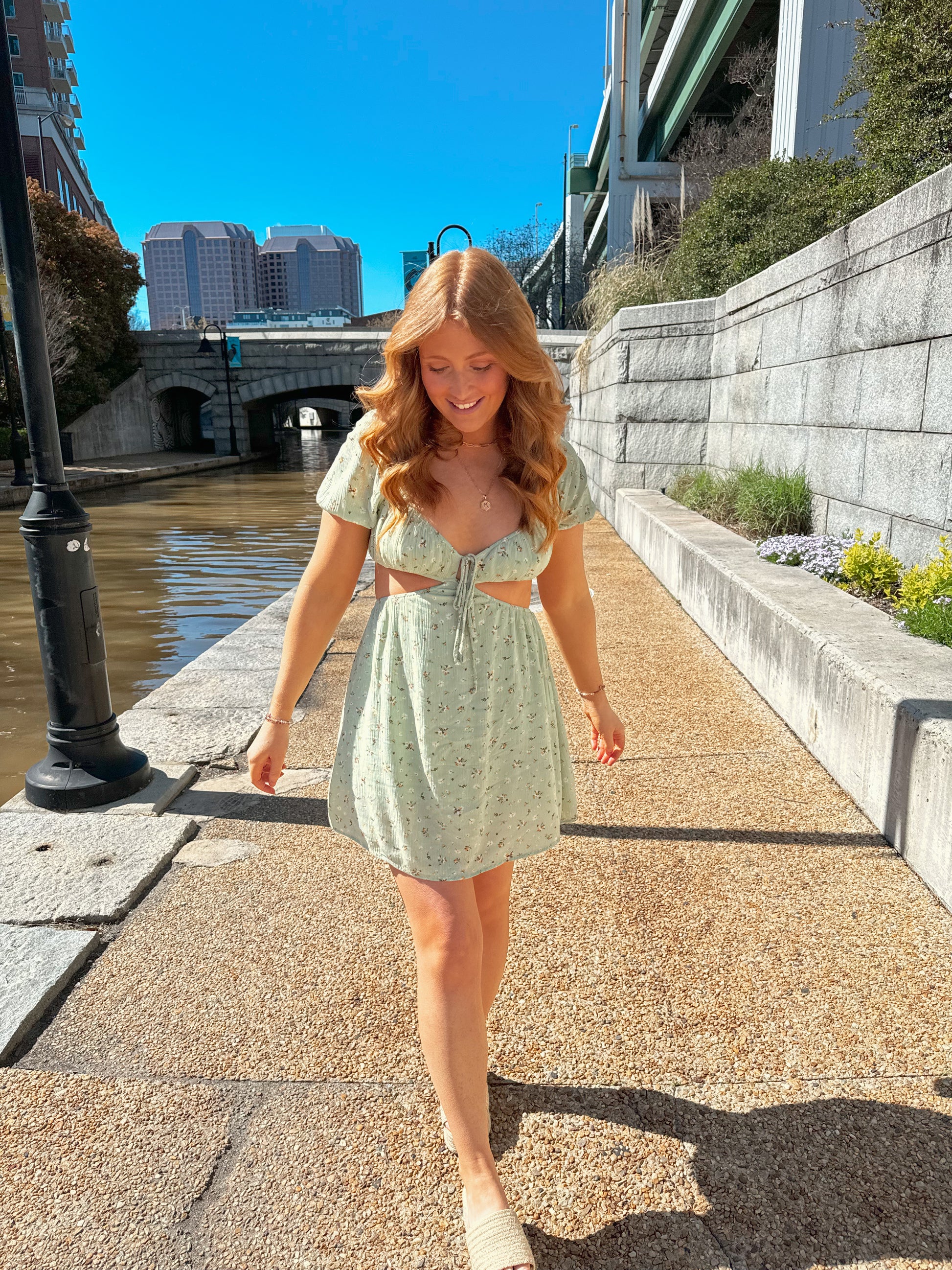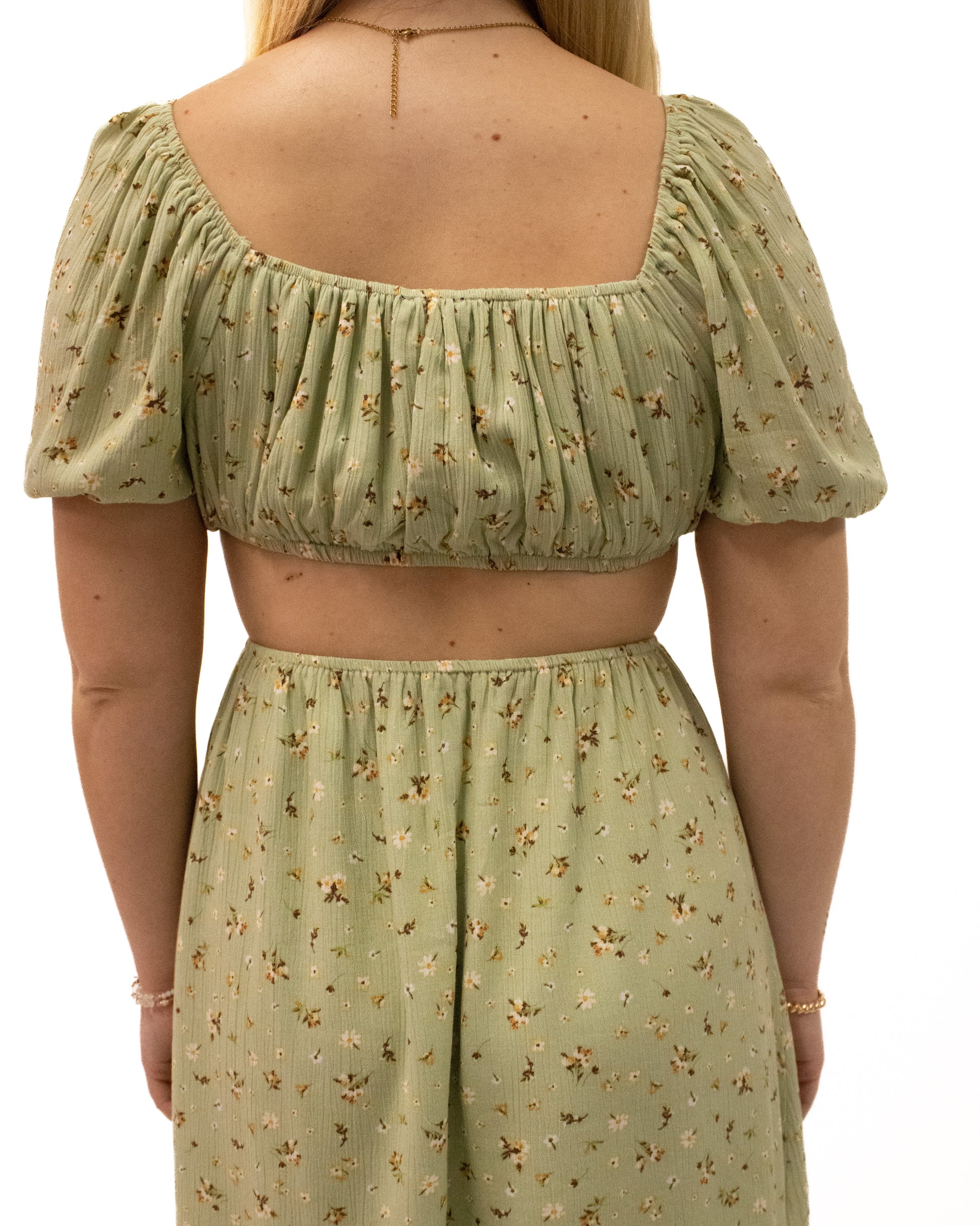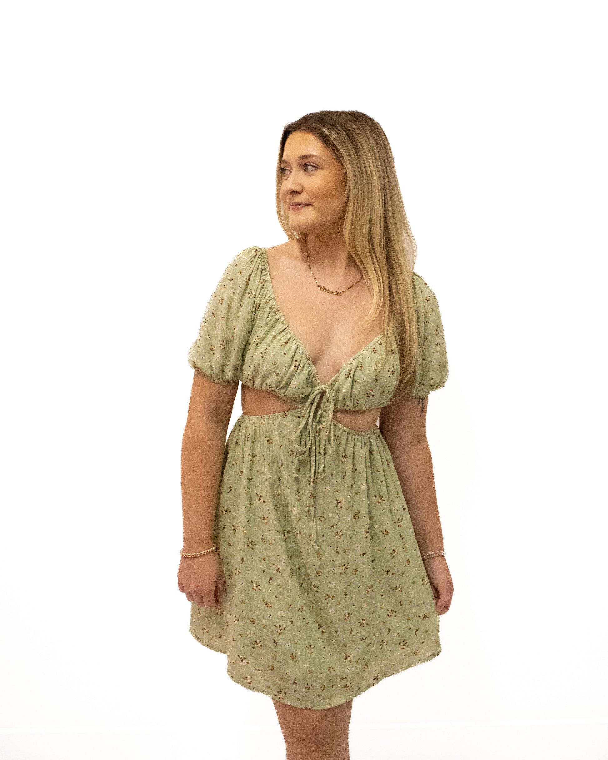 The Morgan Dress is a flowy mini dress with cut outs along the sides and back as well as two strings to tie the front as desired. It has puff sleeves, a deep neckline and is super breathable which makes it a perfect dress to wear at festivals and concerts!