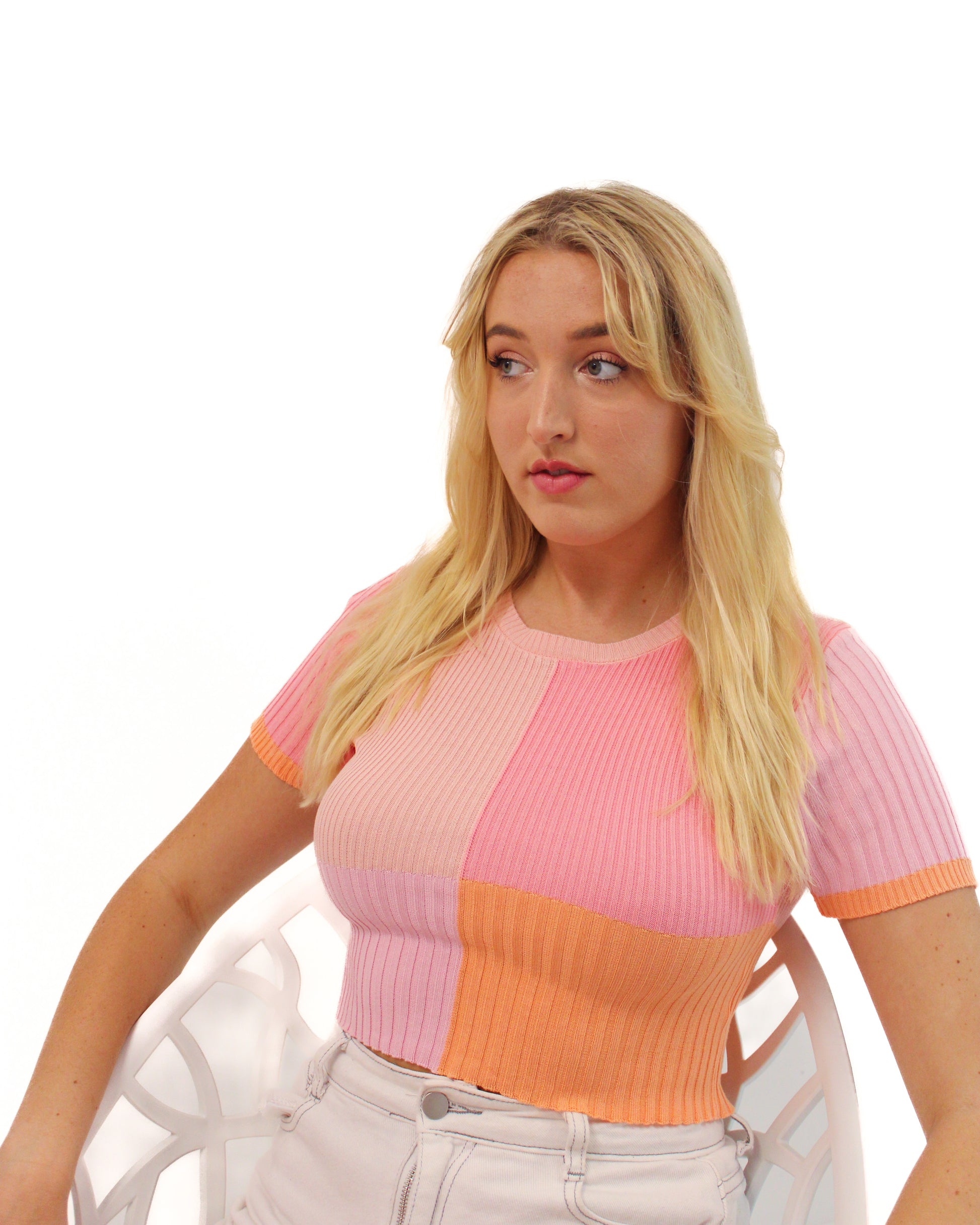 Our Phoebe Top is a color block short sleeve baby tee with ribbing of different widths throughout. It is slightly cropped and hits at the waist, above the belly button. It is extremely soft, stretchy and lightweight and it can be dressed up or down for any occasion! This top runs slightly big, please refer to our dimensions section for reference.