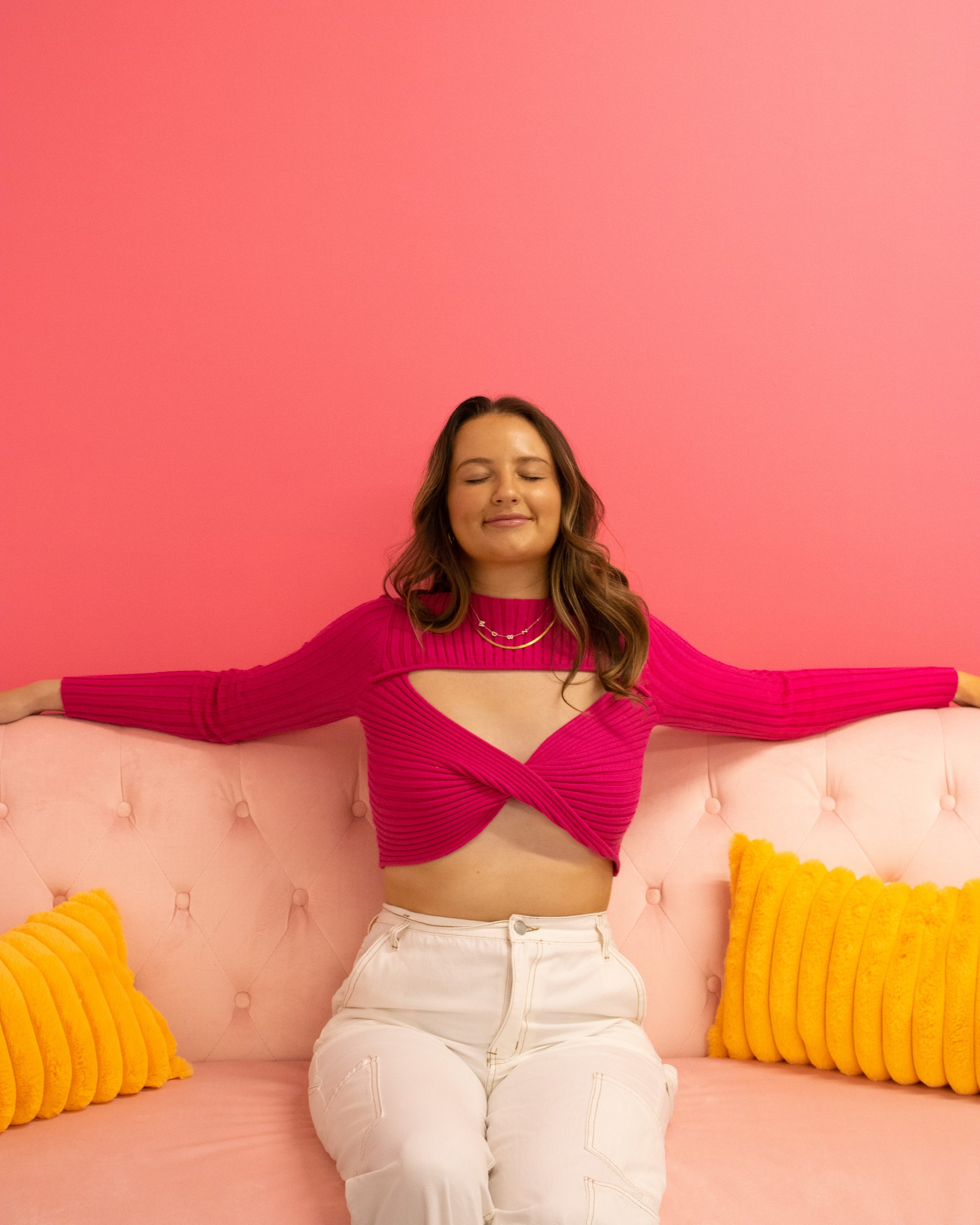 Our Scarlett top is an eye-catching hot pink long sleeve cropped twist top. It offers minimal midriff coverage and a high-neck design with super soft thick ribbed material. This top pairs great with jeans and white shorts and can be used for layering as well.
