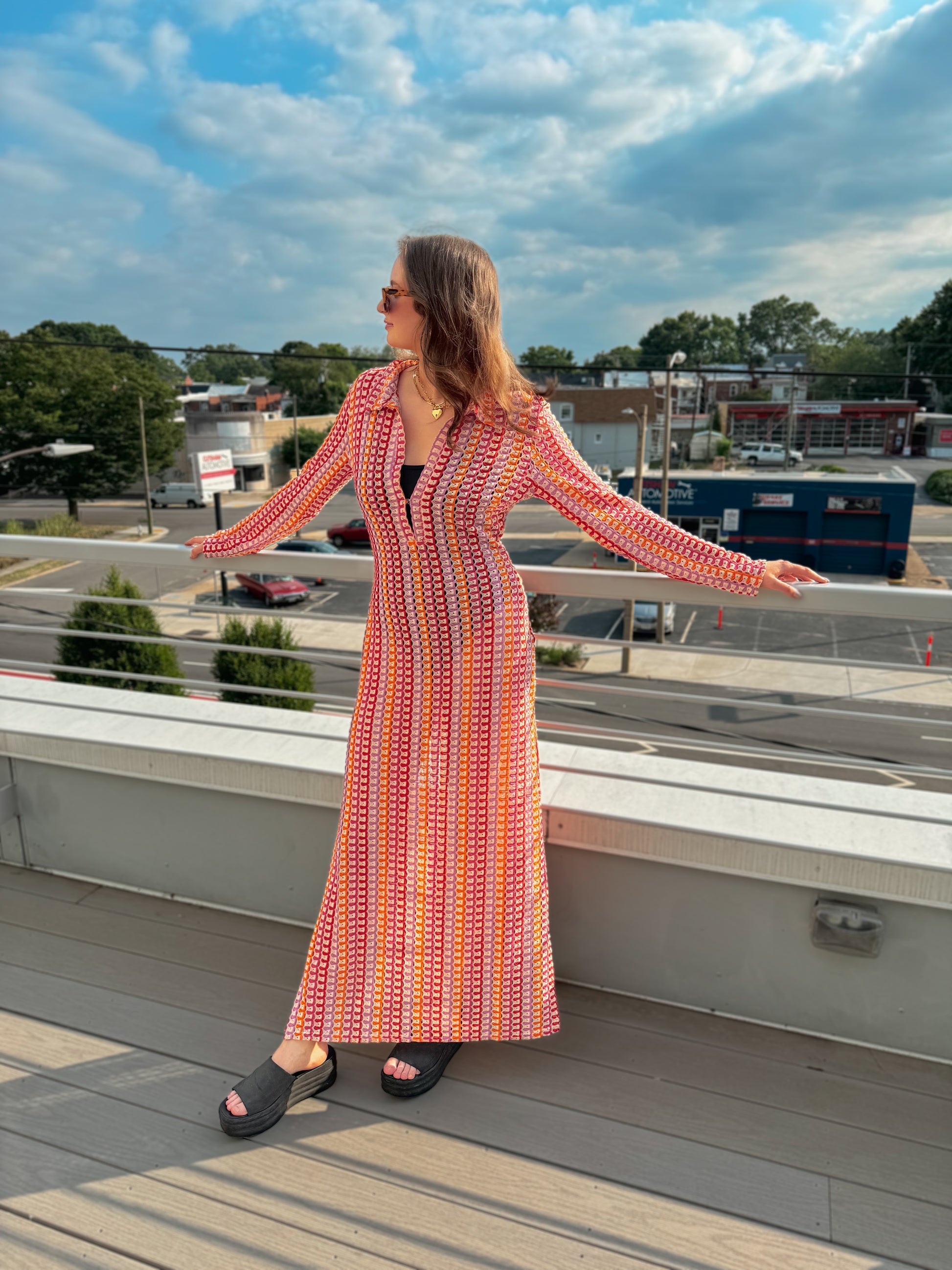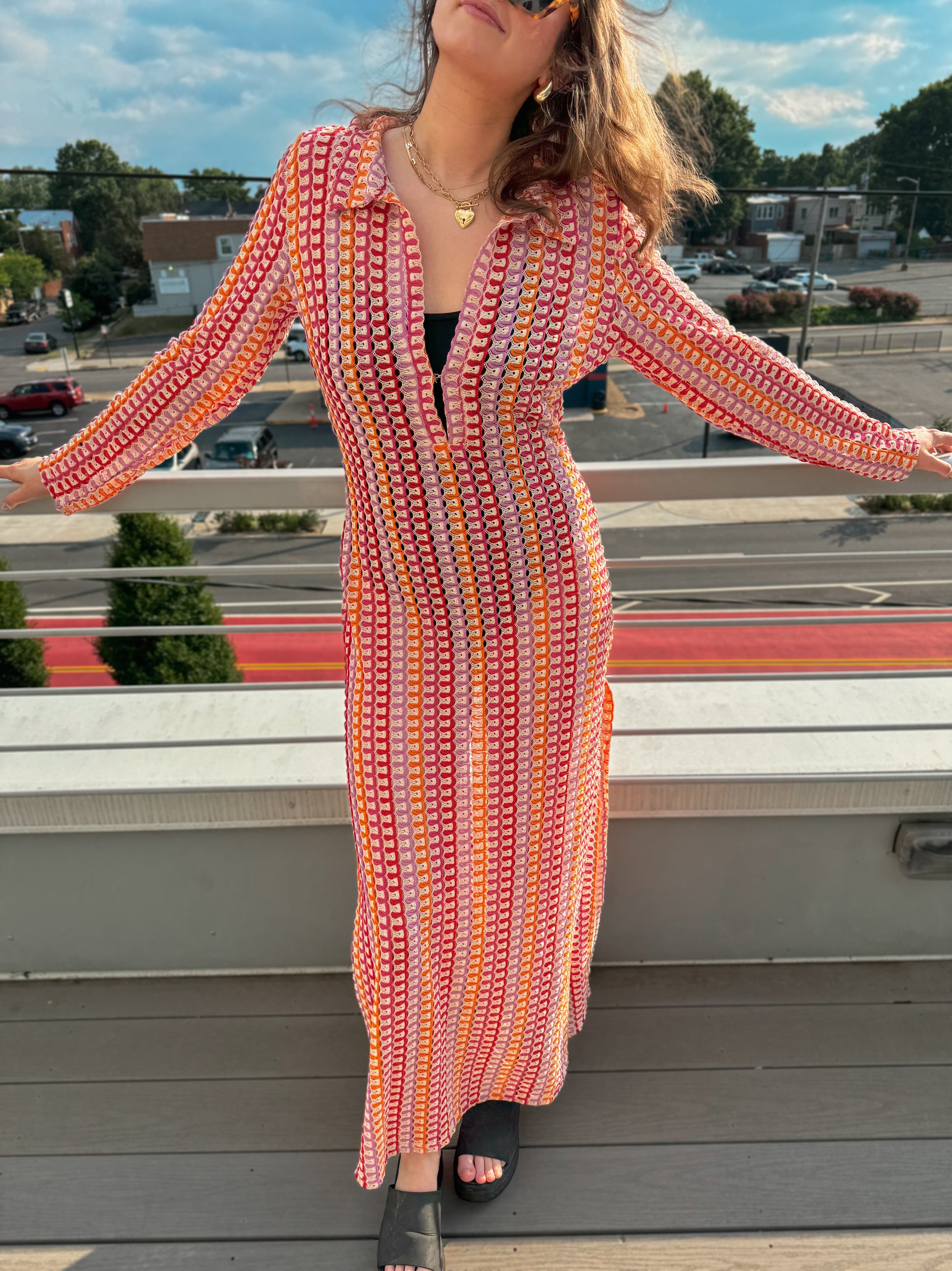 The Sunset Cover Up is a lightweight, knit swimsuit coverup with a collared deep-V neckline which includes a versatile hook & eye clasp. There are slits on both sides starting around the thighs. We’re absolutely obsessed with the knitted lace print plus the colors in this cover-up!