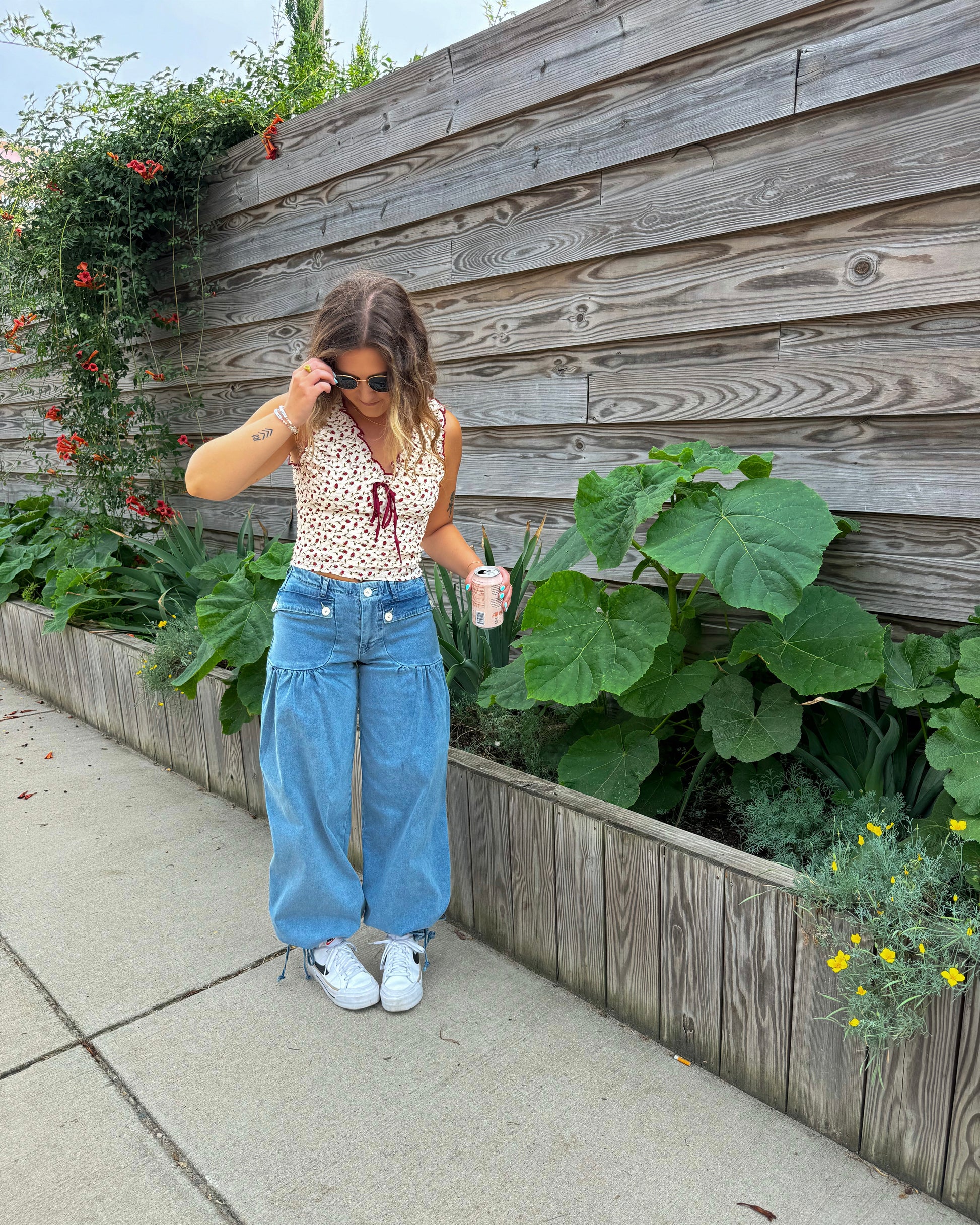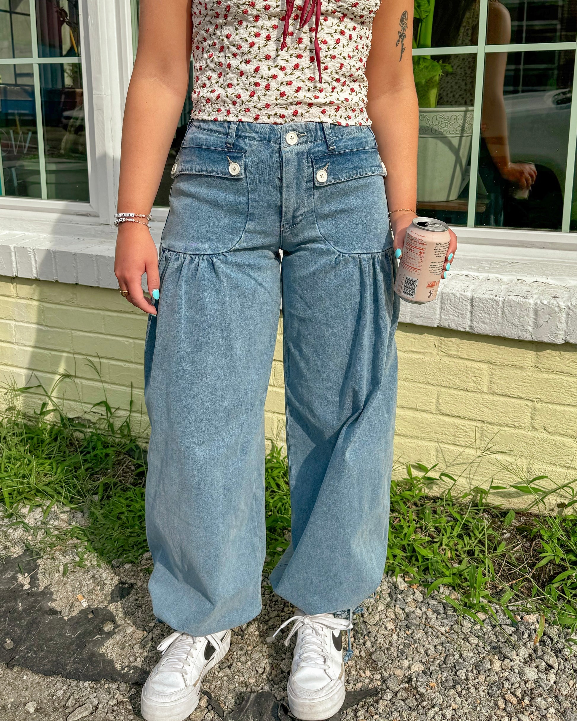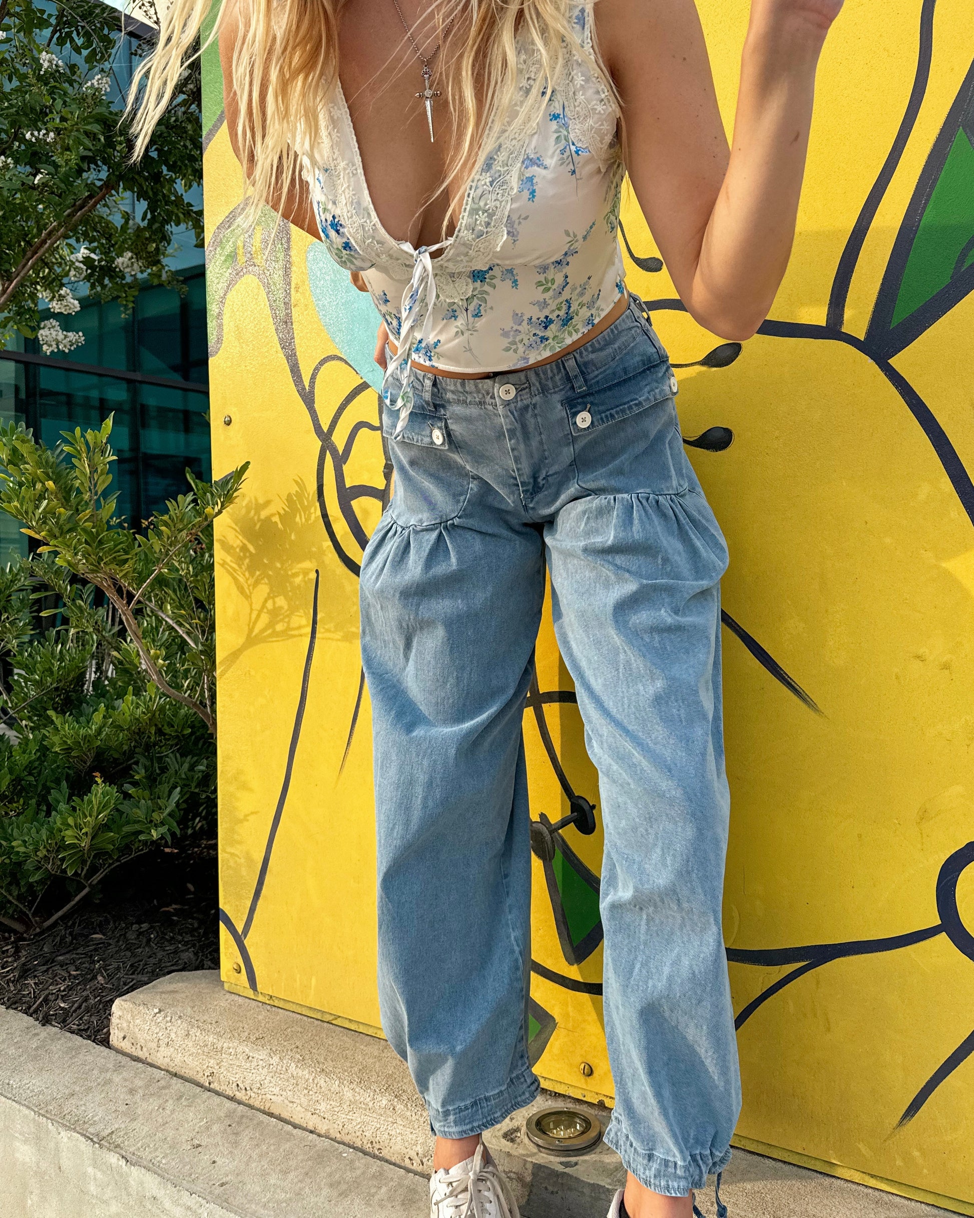The Paloma Jeans are the ultimate "cool girl" jeans! Featuring a mid-rise fit, these jeans have faux pockets that cinch perfectly around the thighs, giving a flattering silhouette. Their wide-leg style and light wash create a trendy look, while the optional ankle cinch provides a versatile jogger-like style. Pair them with our Rose Top for a chic and stylish ensemble!